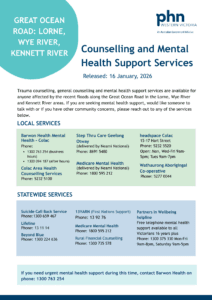 Trauma counselling, general counselling and mental health support services are available for anyone affected by the recent fires in the Colac and Otways area and/or the flooding along the Great Ocean Road impacting the Lorne, Wye River and Kennett River area. If you are seeking mental health support, would like someone to talk with or if you have other community concerns, please reach out to any of the services below.